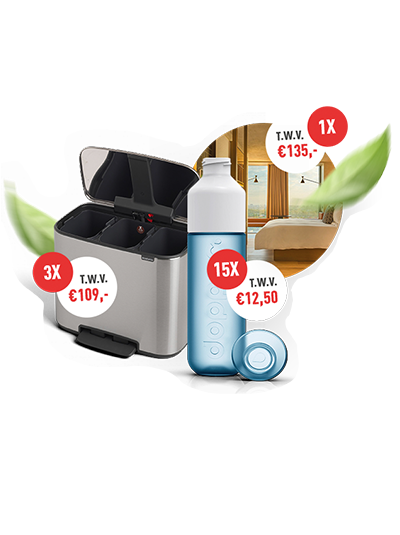 Daarnaast hebben we nog een aantal andere prijzen die je helpen bij een milieuvriendelijk, duurzaam leven. We verloten 15 Dopper flessen en 3 Brabantia Prullenbakken (met 3 scheidingsvakken). Samen aan de Bak voor minder restafval!